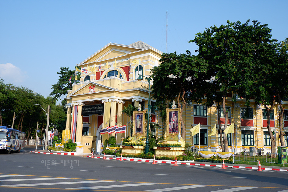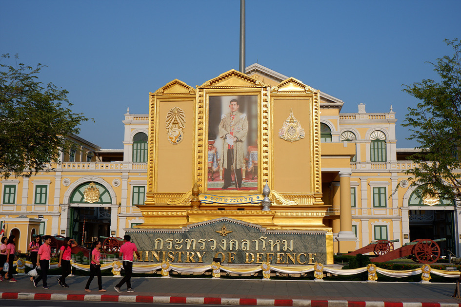 왕궁 건너편의 국방부 건물과 라마 10세 초상